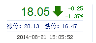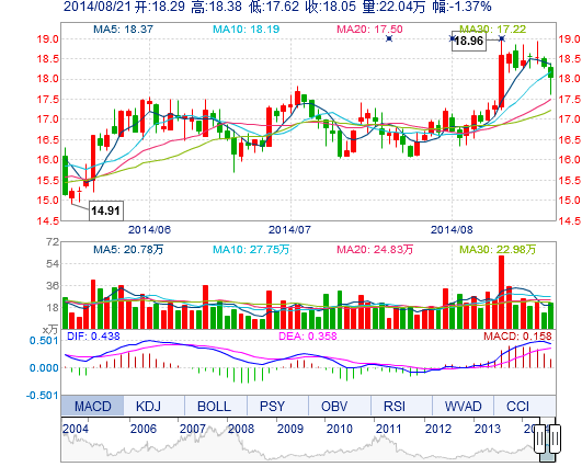 今开: 18.29 成交量: 22.04万手 振幅: 4.15% 最高: 18.38 成交额: 3.95亿元 换手率: 2.30% 最低: 17.62 总市值: 190.53亿 市净率: 5.17 昨收: 18.30 流通市值...