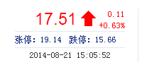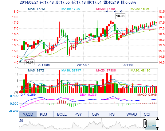 今开: 17.48 成交量: 4.02万手 振幅: 2.13% 最高: 17.55 成交额: 6975.77万元 换手率: 3.00% 最低: 17.18 总市值: 24.28亿 市净率: 6.59 昨收: 17.40 流通市...
