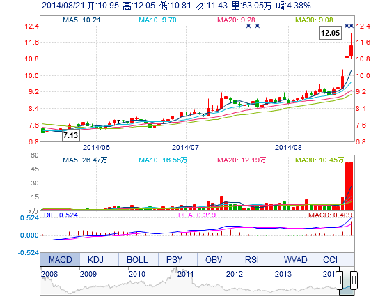 今开: 10.95 成交量: 53.05万手 振幅: 11.32% 最高: 12.05 成交额: 6.10亿元 换手率: 19.30% 最低: 10.81 总市值: 32.58亿 市净率: 5.08 昨收: 10.95 流通市...