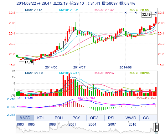 今开: 29.47 成交量: 5.87万手 振幅: 10.51% 最高: 32.19 成交额: 1.83亿元 换手率: 3.38% 最低: 29.10 总市值: 54.55亿 市净率: 15.77 昨收: 29.40 流通市值...