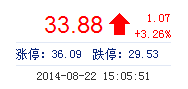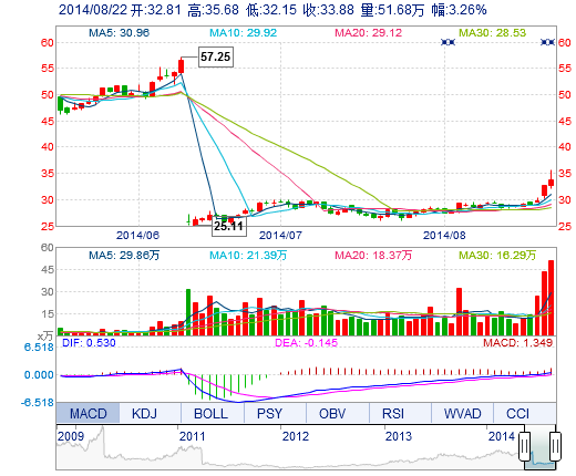今开: 32.81 成交量: 51.68万手 振幅: 10.76% 最高: 35.68 成交额: 17.50亿元 换手率: 8.15% 最低: 32.15 总市值: 221.86亿 市净率: 13.05 昨收: 32.81 流通...