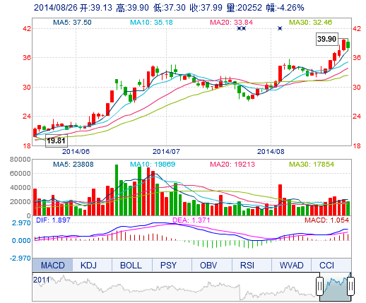 | 最 高: | 39.90 | 成交额: | 7753.56万元 | 换手率: | 5.58% |