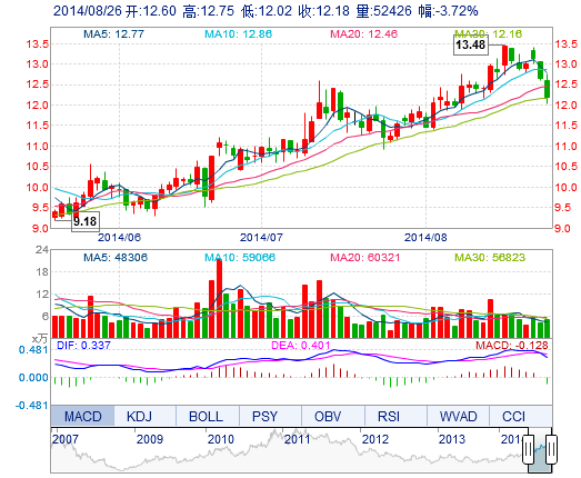 今开: 12.60 成交量: 5.24万手 振幅: 5.77% 最高: 12.75 成交额: 6475.77万元 换手率: 2.64% 最低: 12.02 总市值: 24.27亿 市净率: 4.86 昨收: 12.65 流通市...