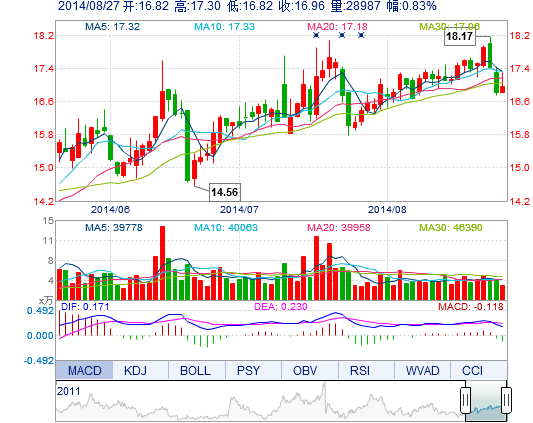 | 最 高: | 17.30 | 成交额: | 4936.42万元 | 换手率: | 2.16% |