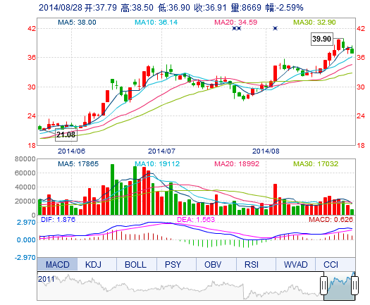 今开: 37.79 成交量: 8669手 振幅: 4.22% 最高: 38.50 成交额: 3267.69万元 换手率: 2.39% 最低: 36.90 总市值: 25.84亿 市净率: 8.79 昨收: 37.89 流通市值...