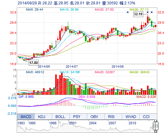 今开: 28.22 成交量: 3.06万手 振幅: 3.33% 最高: 28.95 成交额: 8744.15万元 换手率: 1.76% 最低: 28.01 总市值: 72.41亿 市净率: 14.36 昨收: 28.21 流通市...
