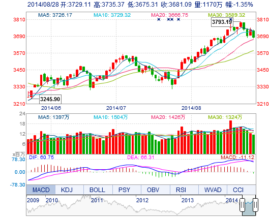 今开: 3729.12 最高: 3735.37 昨收: 3731.51 最低: 3675.31 成交量: 1169.58万手 振幅: 1.61% 成交额: 220.83亿元