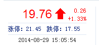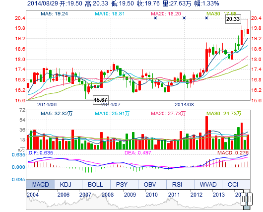 今开: 19.50 成交量: 27.63万手 振幅: 4.26% 最高: 20.33 成交额: 5.54亿元 换手率: 2.89% 最低: 19.50 总市值: 208.62亿 市净率: 5.66 昨收: 19.50 流通市值...