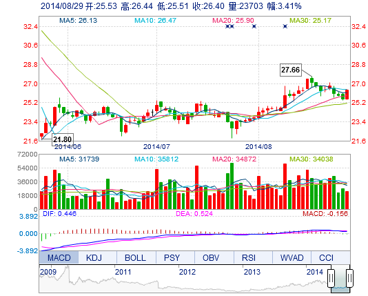 今开: 25.53 成交量: 2.37万手 振幅: 3.64% 最高: 26.44 成交额: 6173.02万元 换手率: 0.45% 最低: 25.51 总市值: 172.51亿 市净率: 9.49 昨收: 25.53 流通市...