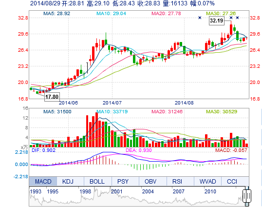 今开: 28.81 成交量: 1.61万手 振幅: 2.33% 最高: 29.10 成交额: 4635.91万元 换手率: 0.93% 最低: 28.43 总市值: 72.47亿 市净率: 14.37 昨收: 28.81 流通市...