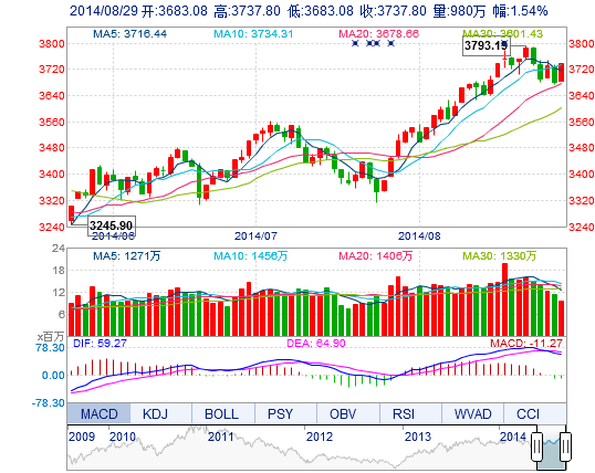 今开: 3683.08 最高: 3737.80 昨收: 3681.09 最低: 3683.08 成交量: 979.98万手 振幅: 1.49% 成交额: 178.47亿元