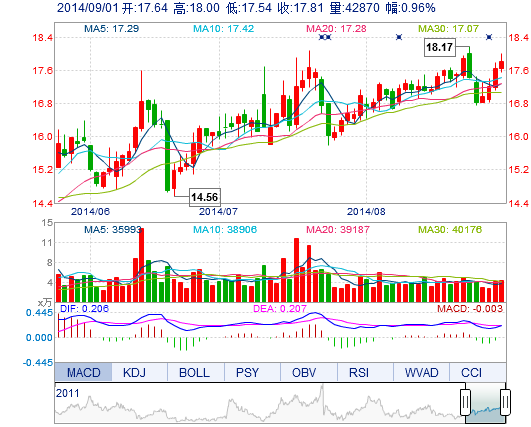 今开: 17.64 成交量: 4.29万手 振幅: 2.61% 最高: 18.00 成交额: 7640.75万元 换手率: 3.20% 最低: 17.54 总市值: 24.70亿 市净率: 6.71 昨收: 17.64 流通市...