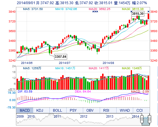 今开: 3747.92 最高: 3815.30 昨收: 3737.80 最低: 3747.92 成交量: 1454.12万手 振幅: 1.80% 成交额: 262.32亿元