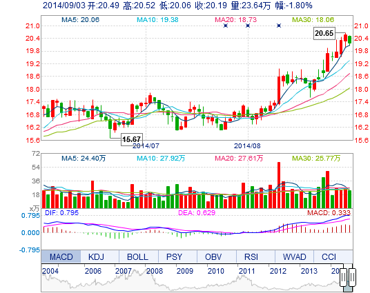 今开: 20.49 成交量: 23.64万手 振幅: 2.24% 最高: 20.52 成交额: 4.79亿元 换手率: 2.47% 最低: 20.06 总市值: 213.16亿 市净率: 5.79 昨收: 20.56 流通市值...