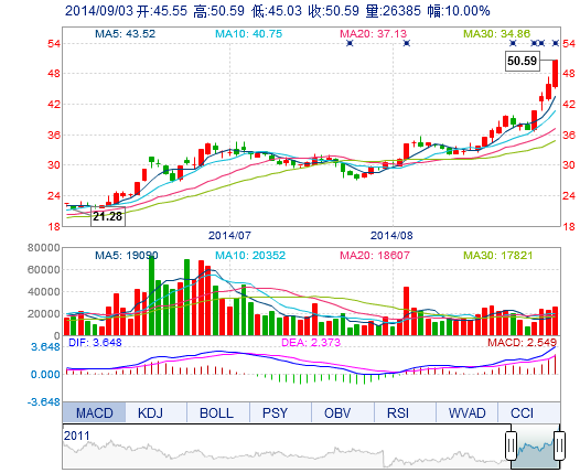 今开: 45.55 成交量: 2.64万手 振幅: 12.09% 最高: 50.59 成交额: 1.29亿元 换手率: 7.28% 最低: 45.03 总市值: 35.41亿 市净率: 12.05 昨收: 45.99 流通市值...
