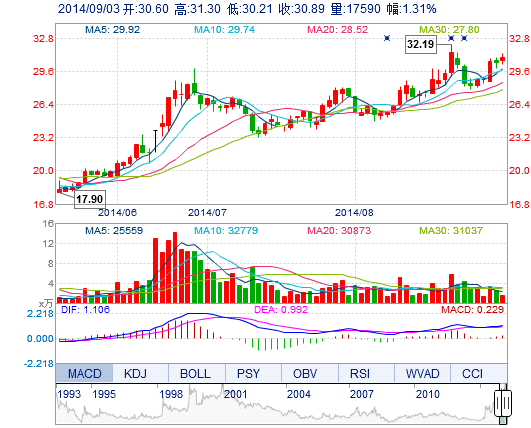今开: 30.60 成交量: 1.76万手 振幅: 3.57% 最高: 31.30 成交额: 5414.92万元 换手率: 1.01% 最低: 30.21 总市值: 77.64亿 市净率: 15.39 昨收: 30.49 流通市...