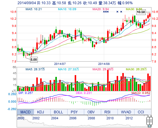 今开: 10.33 成交量: 38.34万手 振幅: 3.08% 最高: 10.58 成交额: 4.00亿元 换手率: 4.30% 最低: 10.26 总市值: 93.48亿 市净率: 3.46 昨收: 10.39 流通市值...