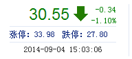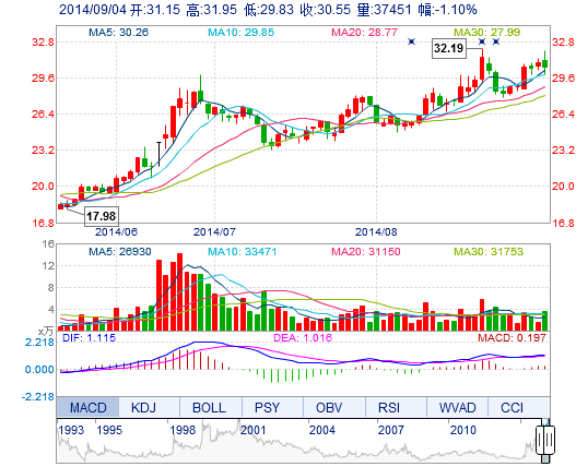 今开: 31.15 成交量: 3.75万手 振幅: 6.86% 最高: 31.95 成交额: 1.15亿元 换手率: 2.16% 最低: 29.83 总市值: 76.79亿 市净率: 15.22 昨收: 30.89 流通市值...