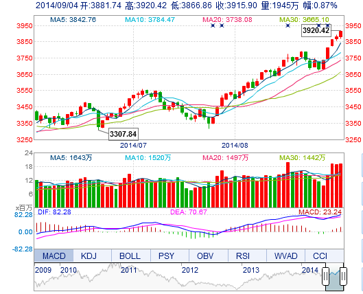 今开: 3881.74 最高: 3920.42 昨收: 3882.27 最低: 3866.86 成交量: 1944.96万手 振幅: 1.38% 成交额: 365.49亿元
