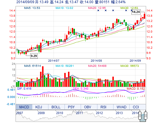 今开: 13.49 成交量: 8.02万手 振幅: 5.65% 最高: 14.24 成交额: 1.12亿元 换手率: 4.03% 最低: 13.47 总市值: 27.89亿 市净率: 5.58 昨收: 13.64 流通市值:...