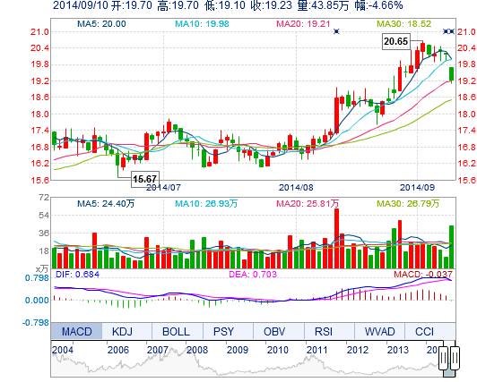 今开: 19.70 成交量: 43.85万手 振幅: 2.97% 最高: 19.70 成交额: 8.45亿元 换手率: 4.59% 最低: 19.10 总市值: 203.02亿 市净率: 5.51 昨收: 20.17 流通市值...