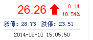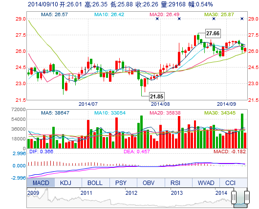 今开: 26.01 成交量: 2.92万手 振幅: 1.80% 最高: 26.35 成交额: 7636.71万元 换手率: 0.56% 最低: 25.88 总市值: 171.60亿 市净率: 9.44 昨收: 26.12 流通市...