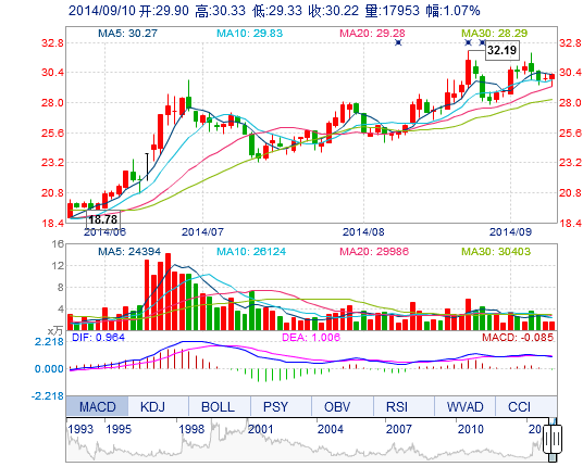 今开: 29.90 成交量: 1.80万手 振幅: 3.34% 最高: 30.33 成交额: 5394.03万元 换手率: 1.03% 最低: 29.33 总市值: 75.96亿 市净率: 15.06 昨收: 29.90 流通市...
