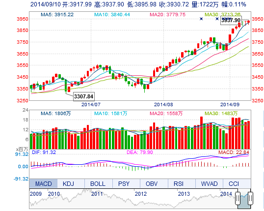 今开: 3917.99 最高: 3937.90 昨收: 3926.35 最低: 3895.98 成交量: 1721.74万手 振幅: 1.07% 成交额: 295.04亿元