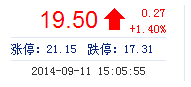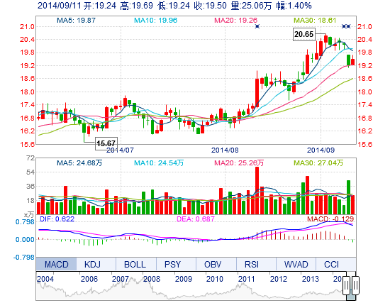今开: 19.24 成交量: 25.06万手 振幅: 2.34% 最高: 19.69 成交额: 4.88亿元 换手率: 2.62% 最低: 19.24 总市值: 205.87亿 市净率: 5.59 昨收: 19.23 流通市值...