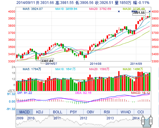 今开: 3931.66 最高: 3981.55 昨收: 3930.72 最低: 3906.56 成交量: 1849.77万手 振幅: 1.91% 成交额: 328.35亿元