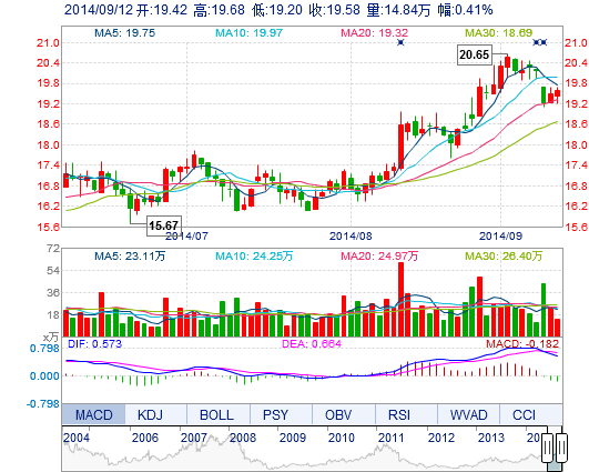 今开: 19.42 成交量: 14.84万手 振幅: 2.46% 最高: 19.68 成交额: 2.89亿元 换手率: 1.55% 最低: 19.20 总市值: 206.72亿 市净率: 5.61 昨收: 19.50 流通市值...