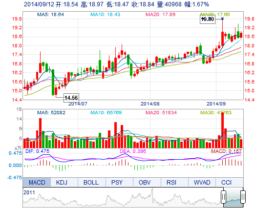 今开: 18.54 成交量: 4.10万手 振幅: 2.70% 最高: 18.97 成交额: 7690.83万元 换手率: 3.06% 最低: 18.47 总市值: 26.12亿 市净率: 7.09 昨收: 18.53 流通市...
