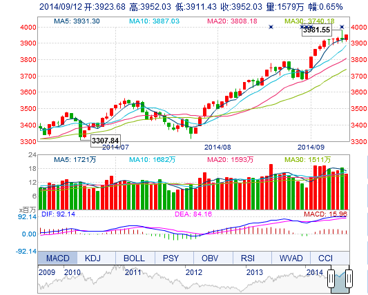 今开: 3923.68 最高: 3952.03 昨收: 3926.51 最低: 3911.43 成交量: 1578.84万手 振幅: 1.03% 成交额: 249.59亿元