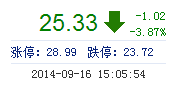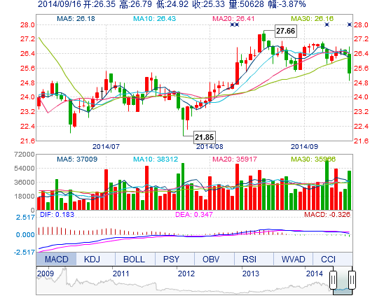 今开: 26.35 成交量: 5.06万手 振幅: 7.10% 最高: 26.79 成交额: 1.32亿元 换手率: 0.97% 最低: 24.92 总市值: 165.52亿 市净率: 9.10 昨收: 26.35 流通市值...
