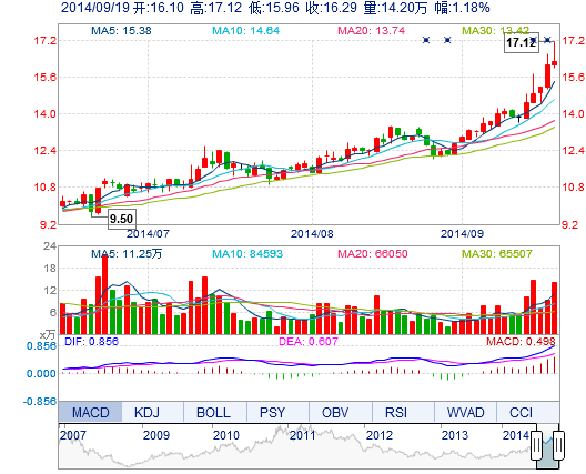 今开: 16.10 成交量: 14.20万手 振幅: 7.20% 最高: 17.12 成交额: 2.33亿元 换手率: 7.14% 最低: 15.96 总市值: 32.46亿 市净率: 6.50 昨收: 16.10 流通市值...