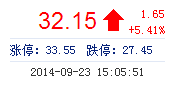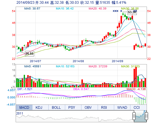 今开: 30.44 成交量: 5.16万手 振幅: 7.70% 最高: 32.38 成交额: 1.60亿元 换手率: 7.91% 最低: 30.03 总市值: 40.51亿 市净率: 7.66 昨收: 30.50 流通市值:...