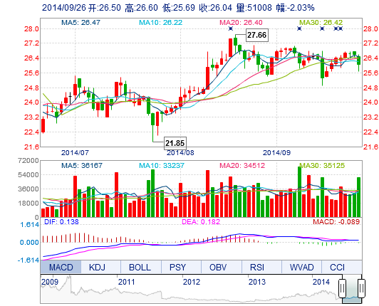 今开: 26.50 成交量: 5.10万手 振幅: 3.42% 最高: 26.60 成交额: 1.33亿元 换手率: 0.97% 最低: 25.69 总市值: 170.16亿 市净率: 9.36 昨收: 26.58 流通市值...