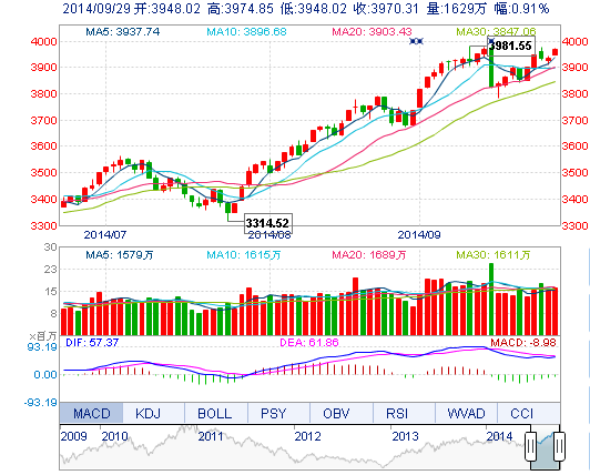今开: 3948.02 最高: 3974.85 昨收: 3934.47 最低: 3948.02 成交量: 1628.77万手 振幅: 0.68% 成交额: 272.93亿元