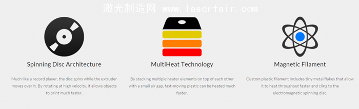 该3D打印机还使用了一种全新的材料加热工艺,该工艺使用一组彼此堆叠的加热元件,他们中间留有很小的空气间隙,而从而使挤出机具备在很短的时间内挤出大量的熔融塑料的能力。