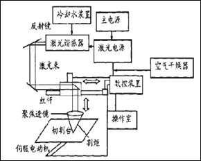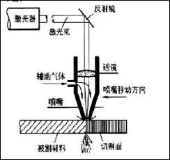 激光切割机是利用经聚焦的高功率密度激光束照射工件,使被照射的材料迅速熔化、汽化、烧蚀或达到燃点,同时借助与光束同轴的高速气流吹除熔融物质,从而实现将工件割开。激光切割属于热切割方法之一。激光切割机的原理见下图。