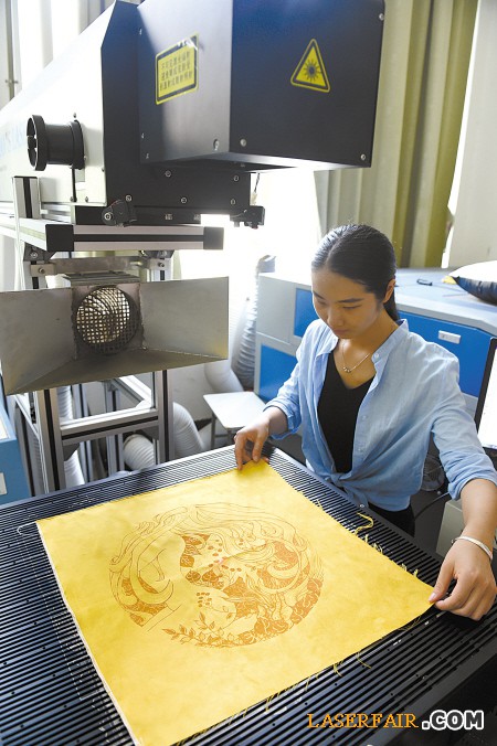 图为激光雕刻现场。 布料上做花型,不外乎印花、提花、绣花,可是现在浙江纺织服装职业技术学院纺织学院的学生们却来了个创