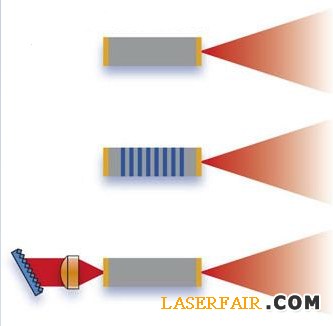 QC激光器的基本结构包括FP-QCL(上图)、DFB-QCL(中图)和ECqcL(下图)。增益介质显示为灰色,波长