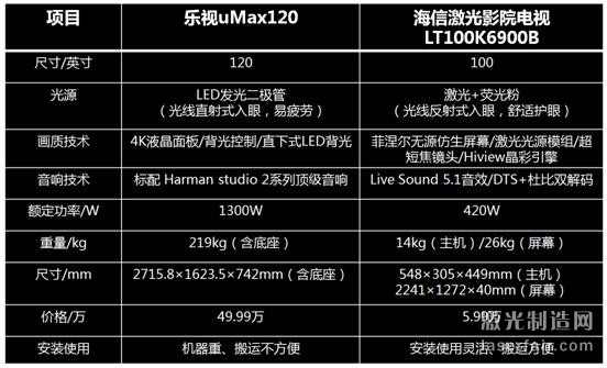 从应用角度看,激光电视还有更多的优势。例如采用和高档巨幕影院一致的反射式光路成像技术,画面柔和舒适,没有液晶的高频蓝光和眩光污染,长期观看视觉不适性极低。激光电视是轻量,紧凑型产品。如海信激光影院产品,主机比电脑机箱还小、屏幕虽然达到100英寸,但是却非常轻,甚至可以卷曲携带。对比而言,乐视120英寸液晶电视重量高达219公斤,且巨大的体积也不能进入一般的居民楼电梯,无法在普通家庭搬运和安装。