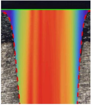简化的仿真程序允许对这些参数进行适当调整,最终结果与实验数据非常吻合:软件界面上下的图像分别实时显示了使用新的计算模型得到的钻孔位置的仿真图像。与以前的方法以及实验相比,参数的改变非常简单,仿真结果以及参数可以在屏幕上实时显示。
