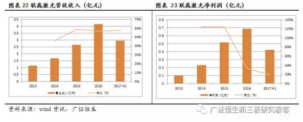 我们在31家新三板激光公司中挑选出激光加工相关的15家,这些公司主要分布在激光产业链中上游,主要业务为上游激光元器件和中游激光器的生产,我们对这15家公司进行分析后发现,其 营业收入2014-2016年平均同比增速54.41%,在2017上半年延续67.86%高速增长,净利润同比增长64.92% ,靓丽业绩验证激光加工行业上半年高景气度,我们认为未来激光加工设备的两个核心驱动力为传统工艺的替代和下游新兴应用的需求拉动,激光加工行业的高景气度有望中长期延续。