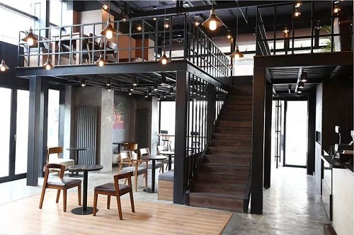 夹层采用碳钢楼梯连接的咖啡厅