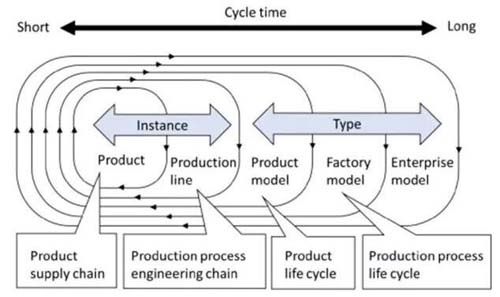 作为一种创新,日本IVI首次提出来一种全新的四循环概念,分别是产品供应链(围绕着产品)、产品工艺链(生产)、产品周期(产品模型)和生产工艺周期(围绕工厂模型),前二者都是物理实例,而后两个周期则属于类型定义。