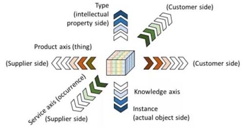 第三个轴:知识轴,是不同寻常的一个提法。它将物理实体作为空间数据模型的一个用例(instance)来看待,这意味着其分类信息、三维造型等都在赛博空间中找到对应类型(Type)。这其中自然涉及到大量的信息转化为知识的结果。物理实体变成用例,是数字化制造过程的一个重要步骤,这是工业互联网时代的一个典型特征。一切皆可数据化。