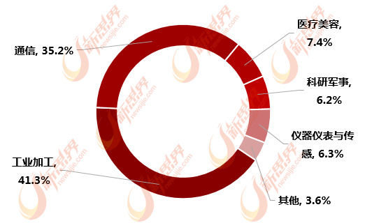 从激光器具体应用行业来看,工业激光器成为目前激光器最大的应用市场。据新思界产业研究中心发布的《2015-2020年中国激光器市场调查及行业分析报告》显示,2017年全球激光器细分应用行业中工业激光器市场规模达到312亿元,占比为41.3%,较2016年的30%提升了超过10个百分点。排名第二的通信领域应用占比为35.20%,医疗美容、科研军事、仪器仪表与传感器的占比分别为7.4%、6.2%和6.3%。