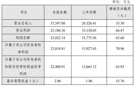 据了解,报告期内公司实现营业收入37,597.80万元,同比增长53.30%;实现归属于母公司所有者的净利润23,810.41万元,同比增长70.96%;报告期末总资产221,089.32万元,较期初增长503.98%;归属于母公司的所有者权益213,993.41万元,较期初增长637.54%。